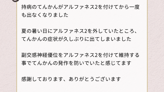 30代男性:「仕事のストレスで発作が起きることが多かったのですが、日中にアルファネス2をずっと着けてますが、気持ちが落ち着いて発作の心配が少なくなりました。」