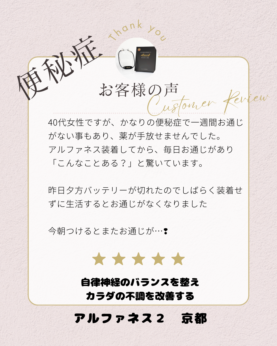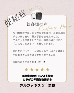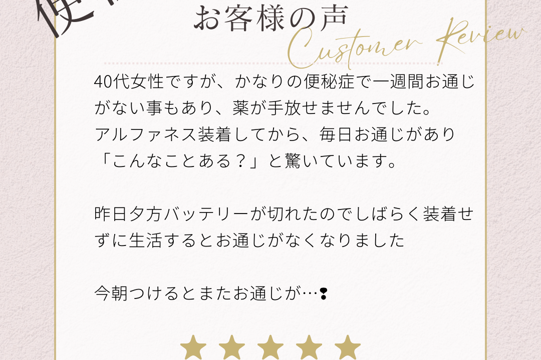 「アルファネスを装着してから、毎日お通じがあり『こんなことある?』と驚いています。」