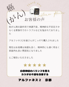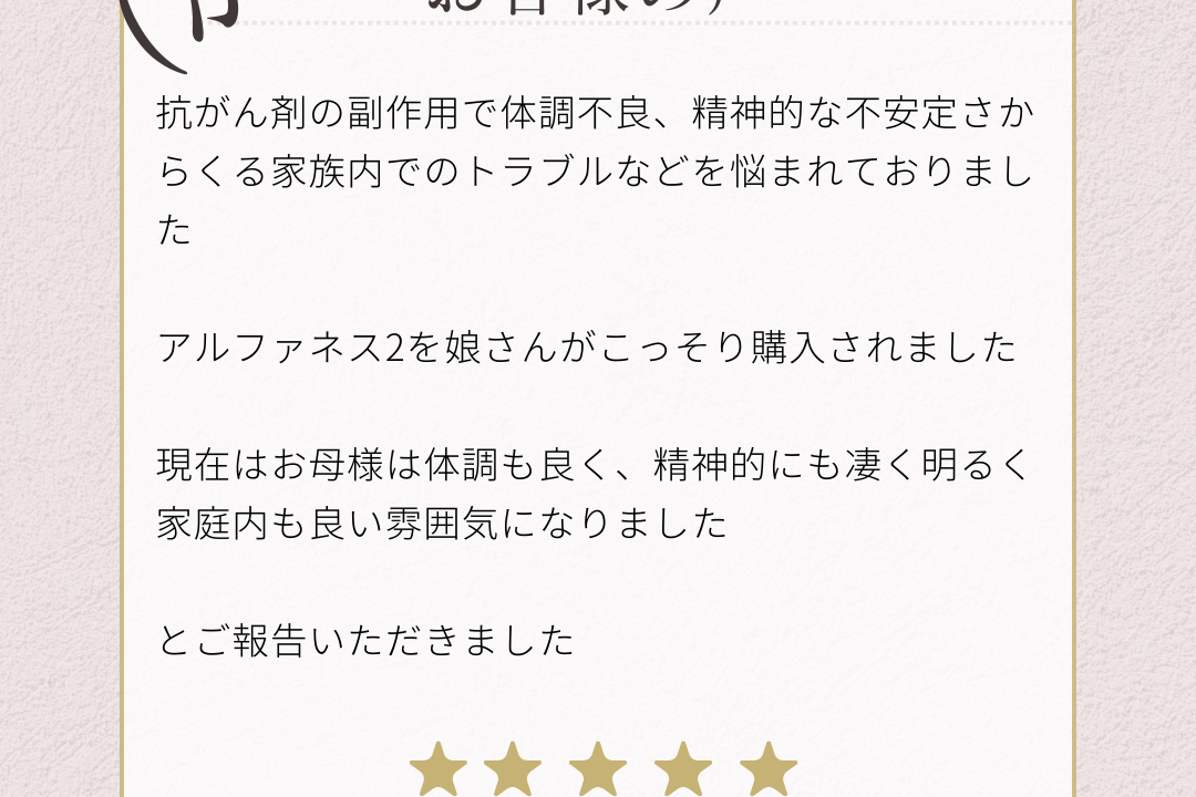 そんな想いから、娘さんは内緒で「アルファネス2」を購入されました。 自律神経を整えることで、お母様の苦しみを少しでも和らげることができれば。そんな祈るような気持ちだったのではないでしょうか。