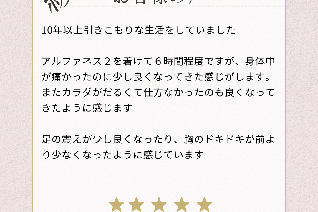 アルファネス2を装着してから、たったの6時間。 10年(約9万時間)という果てしない時間に比べれば、それは瞬きのような短さです。しかし、そのわずかな時間で、お客様の身体には確かな変化が起き始めました。