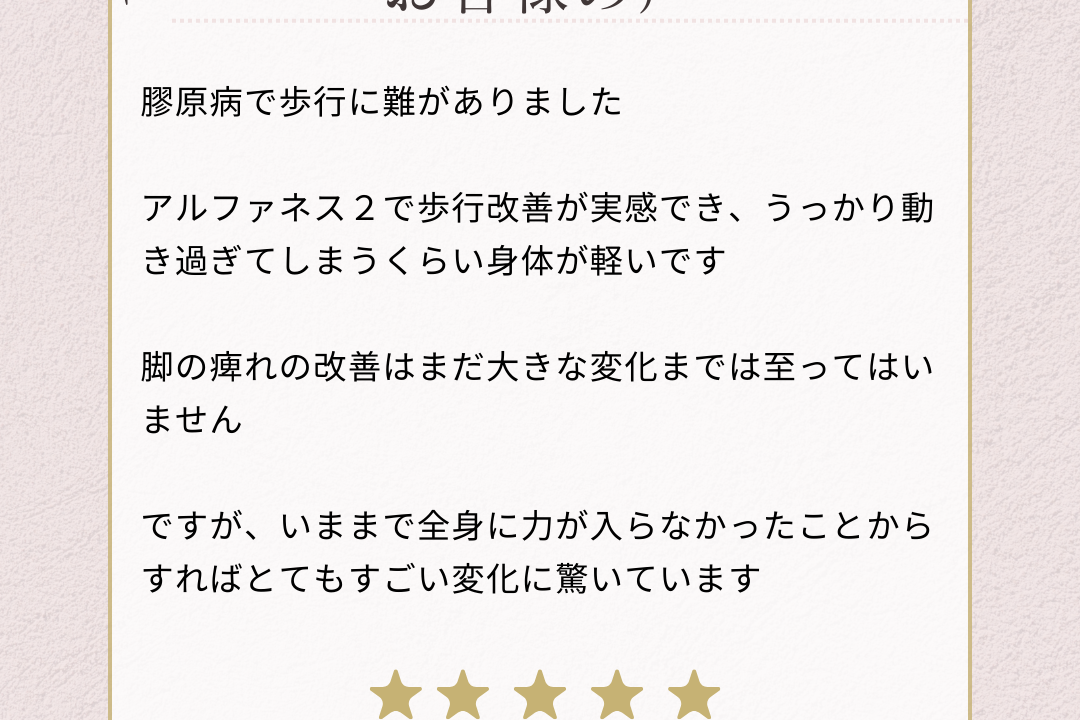 「アルファネス2で歩行改善が実感でき、うっかり動き過ぎてしまうくらい身体が軽いです」