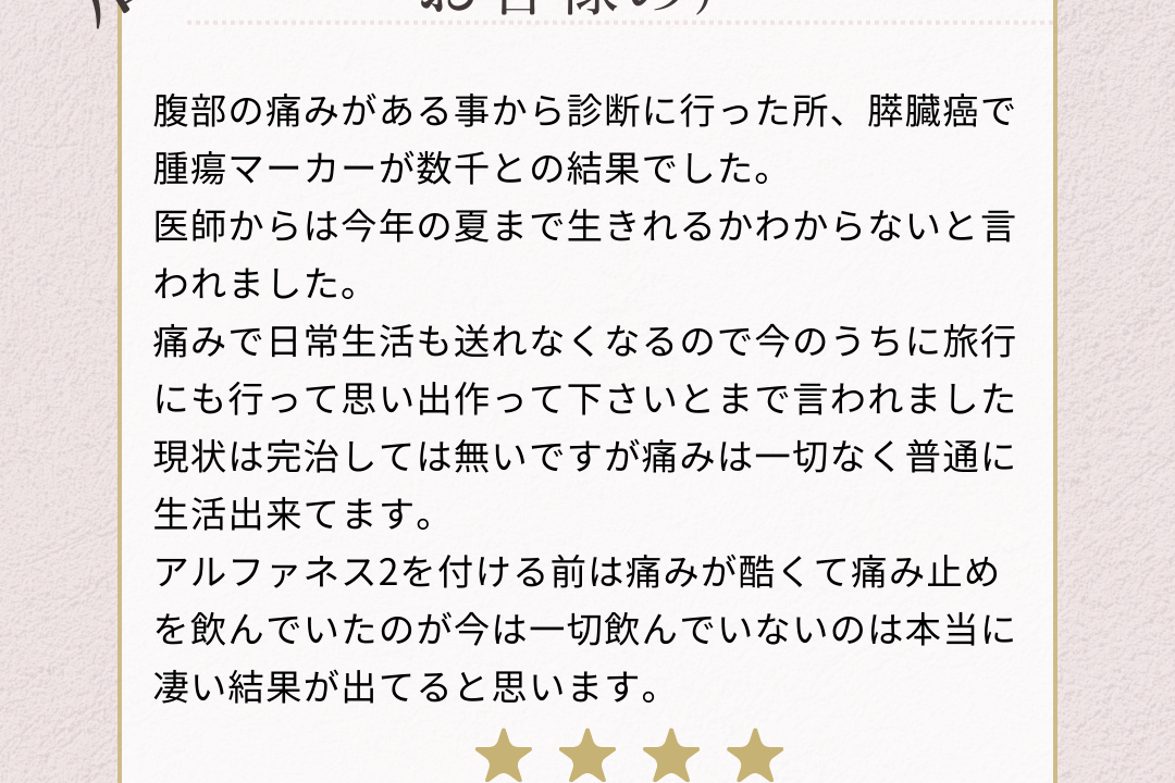 今回のご報告をくださったお客様は、腹部の激痛から検査を受けたところ、膵臓癌が発覚しました。 腫瘍マーカーの数値は、通常では考えられない「数千」。医師からは「今年の夏まで持つかどうか」と、非常に厳しい見通しを告げられました。