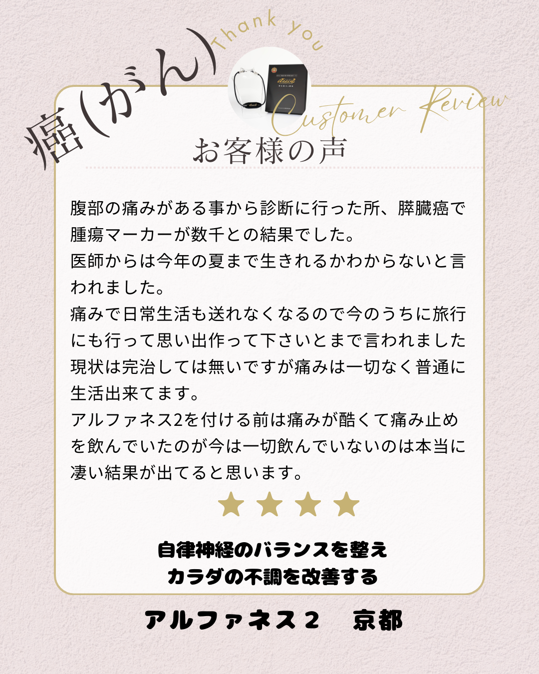 「痛みは一切なく普通に生活出来てます。アルファネス2を付ける前は痛みが酷くて痛み止めを飲んでいたのが、今は一切飲んでいないのは本当に凄い結果が出てると思います」