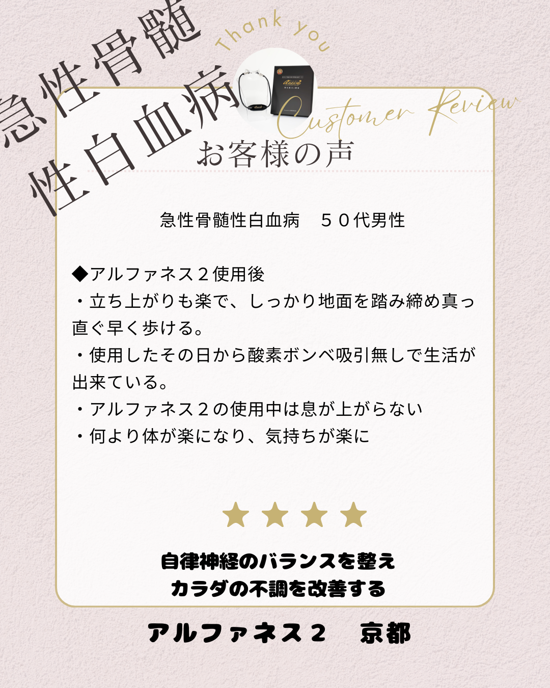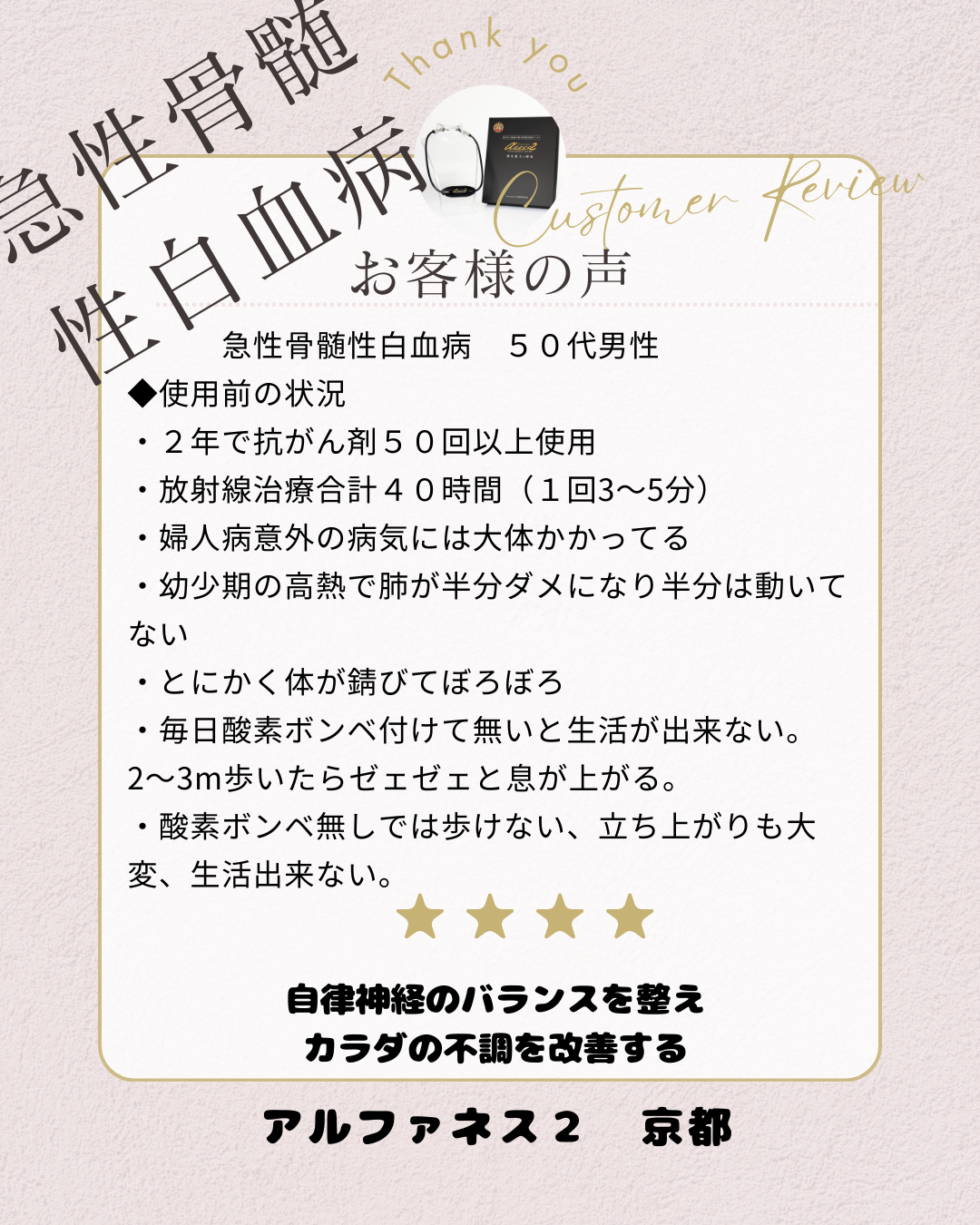 こんにちは。 私たちは、自律神経の可能性を信じて「アルファネス2」をお届けしていますが、時に、私たちの想像を遥かに超える、震えるようなご報告をいただくことがあります。